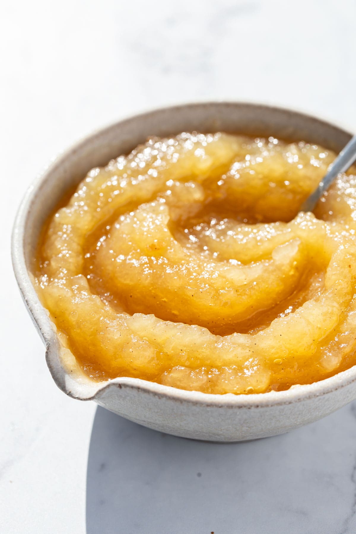 Spouted ceramic bowl filled with a swirl of homemade applesauce, with a spoon of applesauce sitting on the side.Spouted ceramic bowl filled with a swirl of homemade applesauce, with a spoon of applesauce sitting on the side.