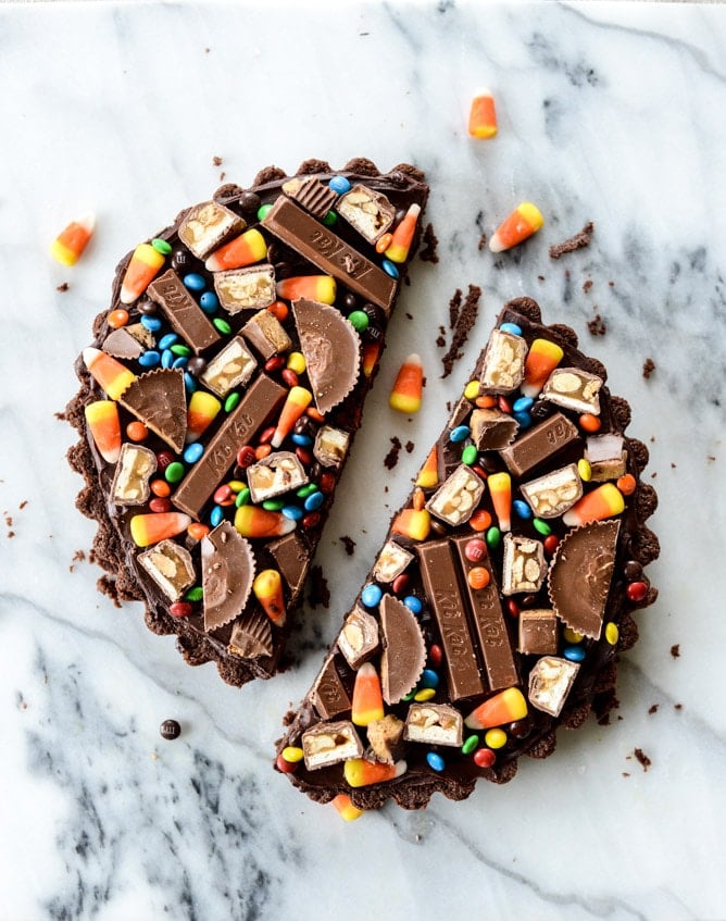 Use some Halloween candy for this peanut butter nutella brownie tart!