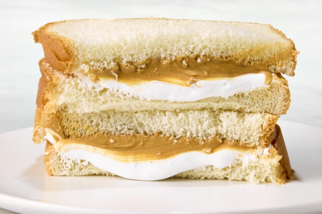 Lay two slices of soft, white sandwich bread on a cutting board. Spread marshmallow crème in an even layer on one slice and creamy peanut butter on the second slice. Sandwich the fillings together and cut in half with a sharp knife. Enjoy!