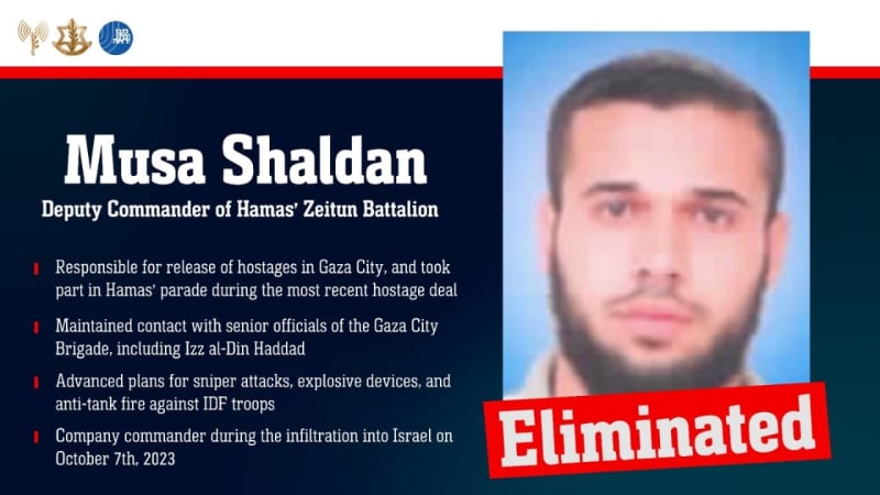 Hamas terrorist Musa Shaldan was killed in Gaza City last week, the IDF and Shin Bet (Israel Security Agency) confirmed in a joint statement on Monday.