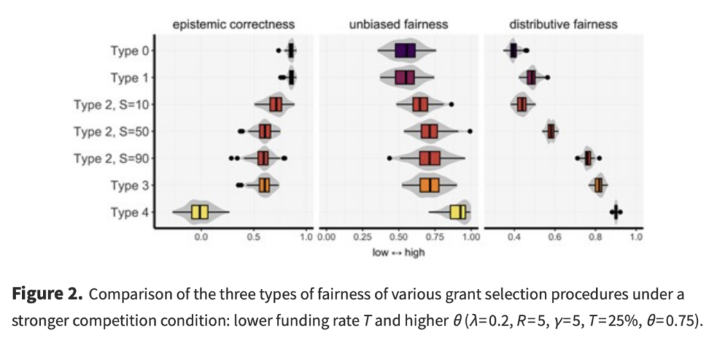 In any event, the authors actually ran simulations of the various methods. You can read the paper in depth if you want, but, to summarize, there was increasing distributive (“funding should be distributed evenly.”) and unbiased fairness (“funding should be distributed without gender, racial, geographic, or other biases.”) as the investigators modeled methods from Type 0 to type 4 that was associated with decreasing epistemological correctness (“funding should go to the ‘best’ proposals”), the effect being less pronounced in terms of epistemological correctness in the high competition condition (low paylines), which, truth be told, has ben the situation with NIH funding since I’ve been faculty. You can get an idea of what I mean from this figure: