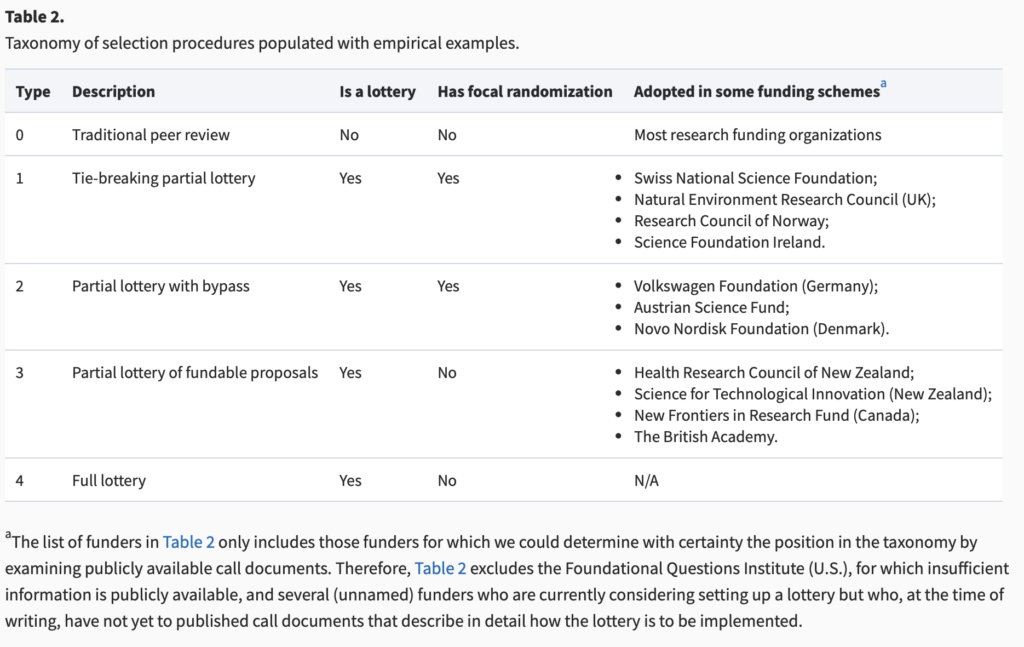 Also, contrary to Dr. Prasad’s have been a number of studies examining whether priority scores for grant applications are predictive of productivity of the PI doing research using the grant funds. Indeed, Feliciani et al recently published a taxonomy of funding mechanisms that involve a lottery, all or in part. Here’s a chart from the review article: