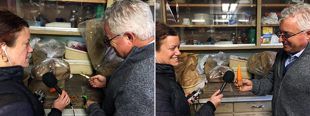 Cynthia and Irwin Goldman looking at a wild carrot (left) and domesticated carrot (right). Photo by Nicola Twilley.