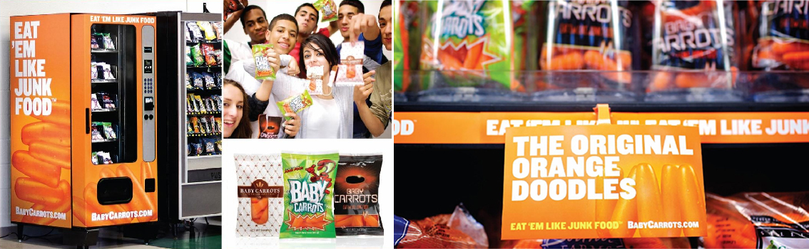 Elements of the CPG “Eat ‘Em Like Junk Food” campaign for baby carrots.